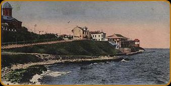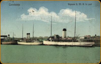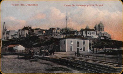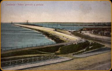 Constanta privită din port Mahalaua Tătarilor Scoala Primară Piata Ovidiu Vapoare în port Vedere generală asupra portului Băile de mare din Constanta Vedere dinspre mare