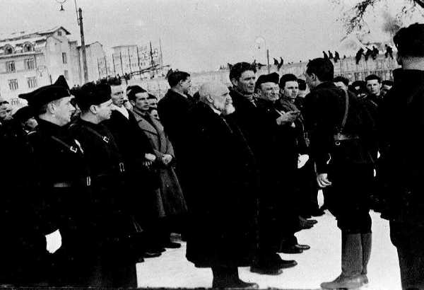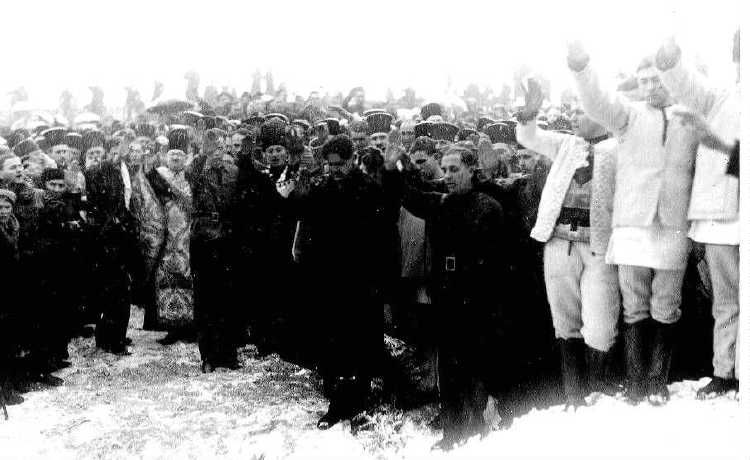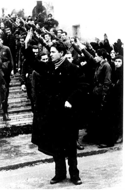 Corneliu Zelea Codreanu salutând masele de legionari din fata Bis. Sf. Ilie-Gorgani din Bucuresti, cu prilejul înmormântãrii eroilor Mota-Marin cãzuti pe frontul anticomunist din Spania