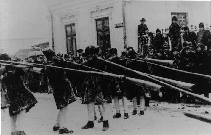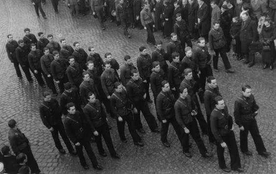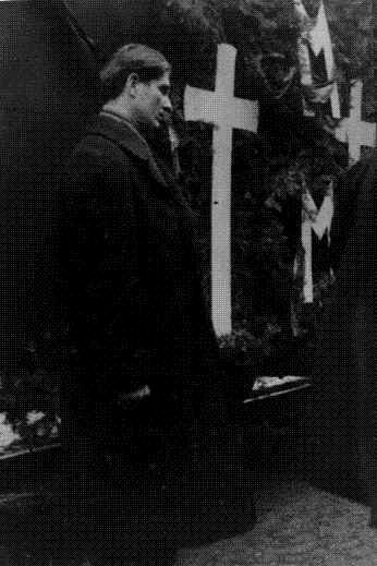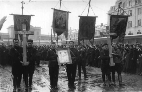 Căpitanul Corneliu Z. Codreanu păsind alături de trupurile celor doi camarazi eroi, Ion Mota si Vasile Marin, în drum spre Mausoleul "Mota-Marin" dela Casa Verde din Bucuresti
