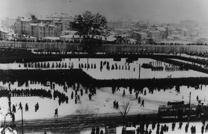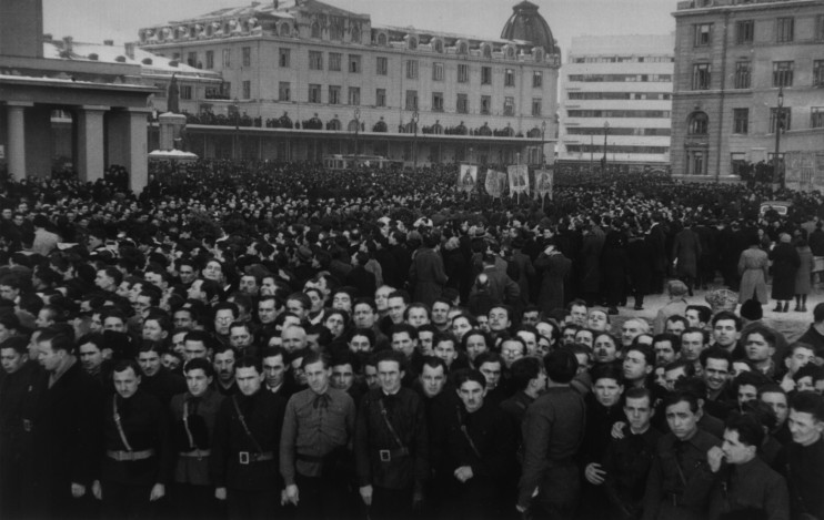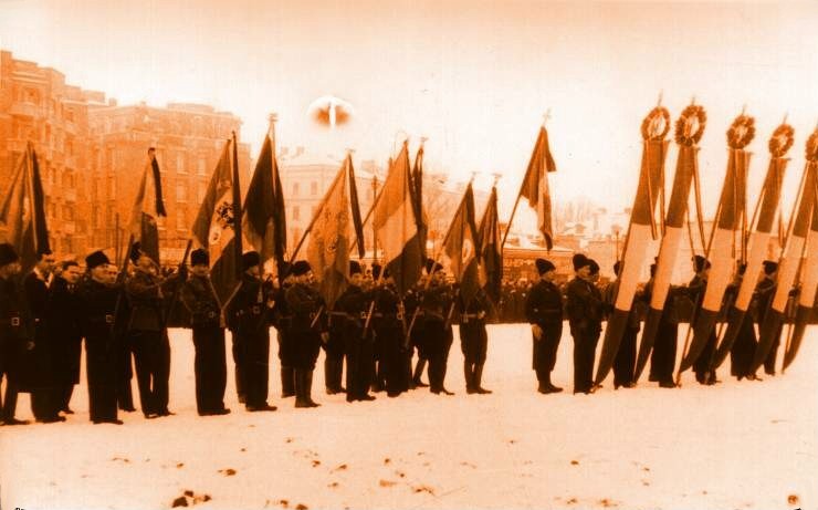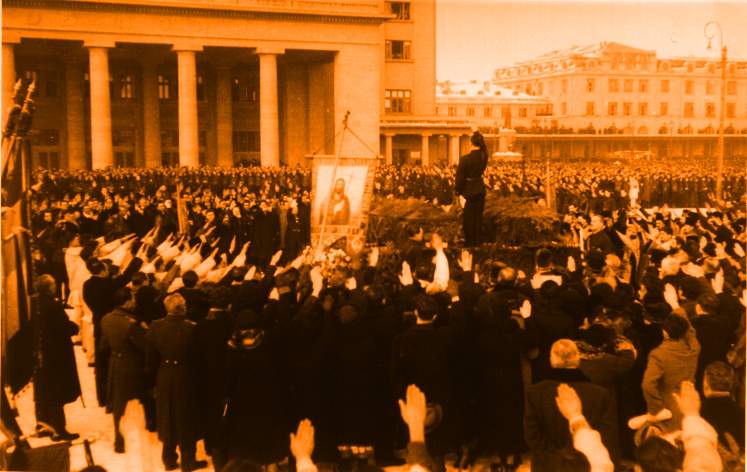 In fata Gării de Nord: steagurile organizatiilor legionare se pleacă în fata cutremurătoarei jertfe de pe frontul dela Majadahonda în apărarea Crucii si Civilizatiei Crestine