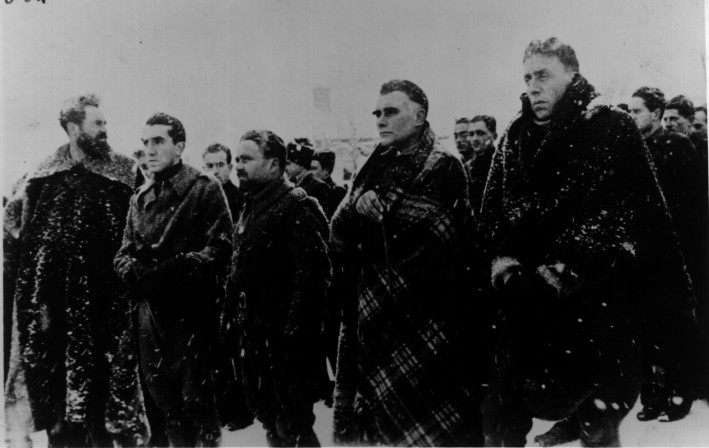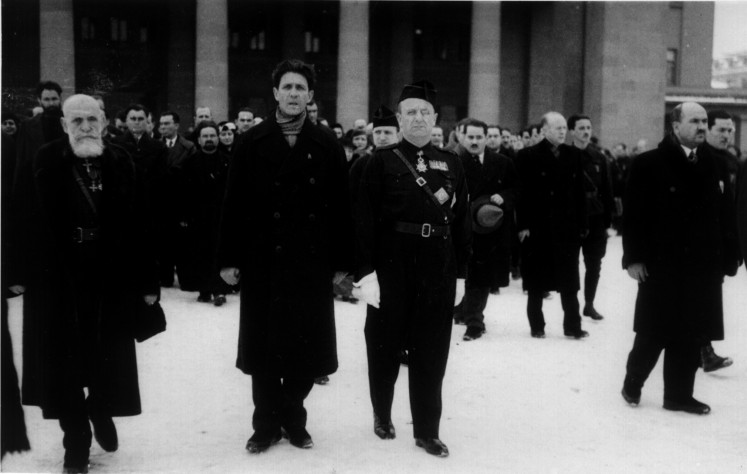 Gen. Gheorghe Cantacuzino Grănicerul, Corneliu Zelea Codreanu, Prat y Soutzo (asmbasadorul Spaniei la Bucuresti) si alte persoane oficiale întâmpinând trupurile celor doi eroi la sosirea lor în Gara de Nord din Bucuresti -Februarie 1937.